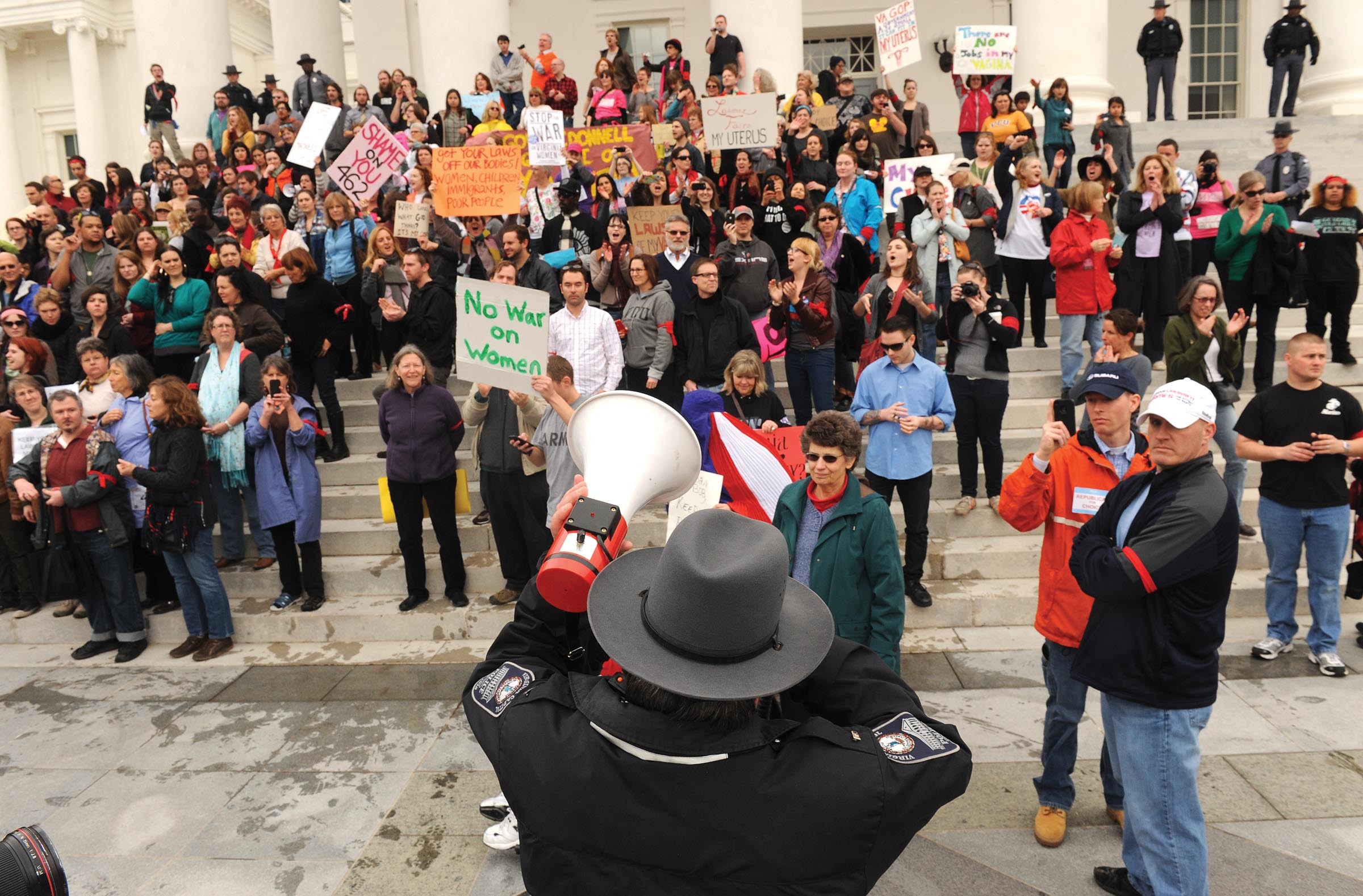 The images are difficult to shake. In an otherwise quiet and apathetic city, on a mild and overcast Saturday afternoon, state troopers wearing riot gear — helmets, body armor, shields and assault rifles — drag more than two dozen women and men from the steps of the State Capitol. That women’s rights demonstration on March 3, a protest of General Assembly overreach, led to 30 arrests and troubling dĂ©jĂ vu, conjuring Vietnam marches and civil rights rallies of bygone eras. The photos seem eerily out of context. Could this really be Richmond, circa 2012?