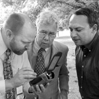 “This has a graphical interface to help locate objects on the ground,” he tells them. He moves to the north side of the median and stops opposite Dr. Wyatt Beazley’s house. “We’ll try that maple there,” Pokorny says, pointing to the left of the stately brick house. Beazley and City Councilman William J. Pantele huddle around Pokorny and observe.