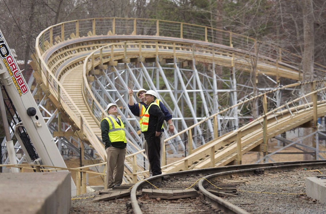 It has 96,000 bolted connections, more than 5½ tons of nails, 180 tons of steel, 10,000 cubic feet of lumber and 2,500 cubic yards of concrete. Designers of wood coasters often use southern yellow pine wood because it’s strong and predictable, House said.