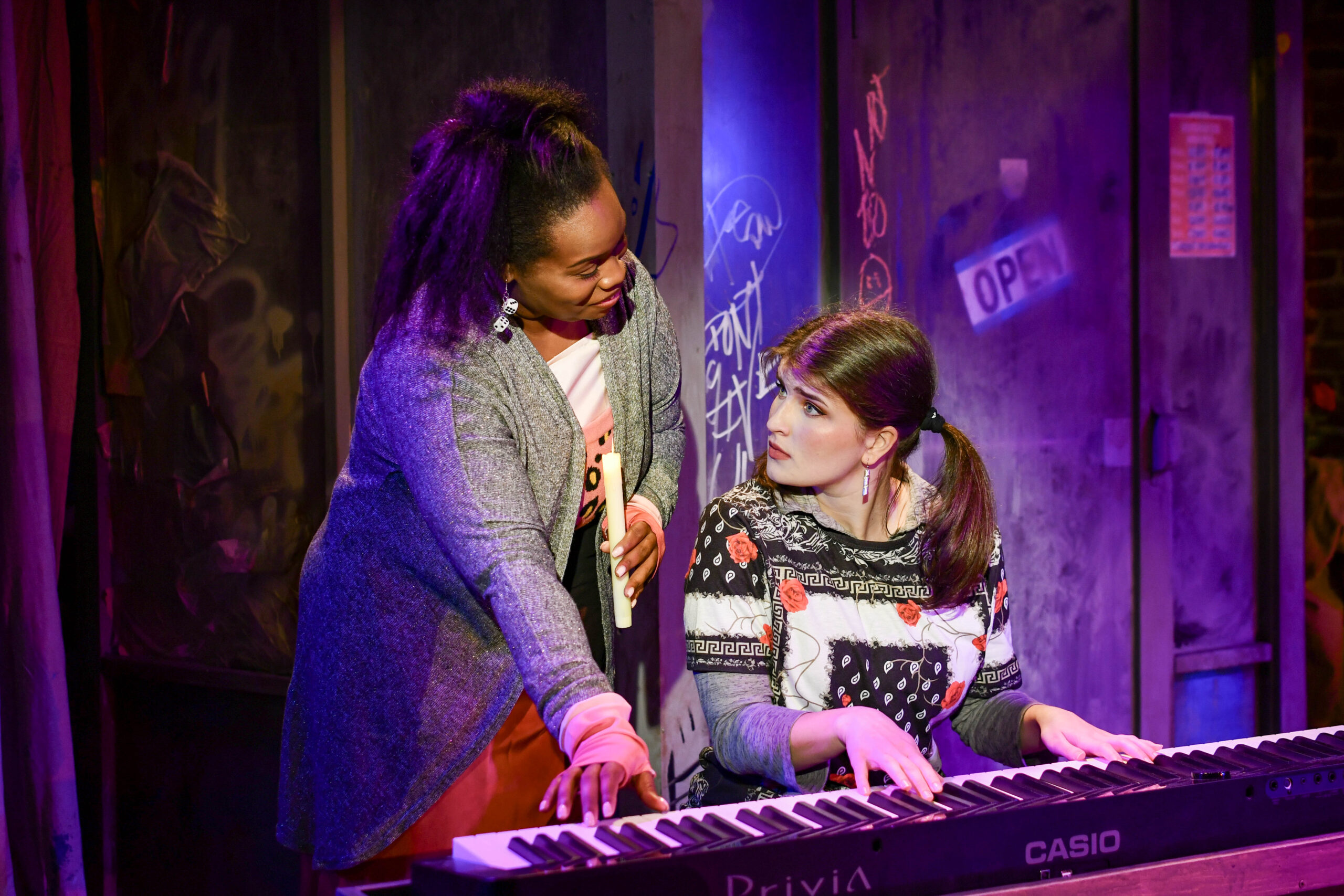 The action plays out on a believably roughed-up stage (scenic design by Dasia Gregg), complete with graffiti and artfully random refuse. Lighting designer Joe Doran provides effective visual punctuation like strobes in concert scenes.