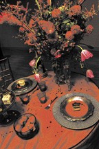 The other tables varied in mood. Some were sophisticated like Gary Inman’s jazz-inspired dessert table. Others were whimsical like Mason-Butler’s pink-and-green frog prince table with a towering flower arrangement of berries and wispy greens. And still others stressed celebration, like Chris McCray’s New Year’s in New York table that incorporated the dropping New Year’s ball as an elevated centerpiece.