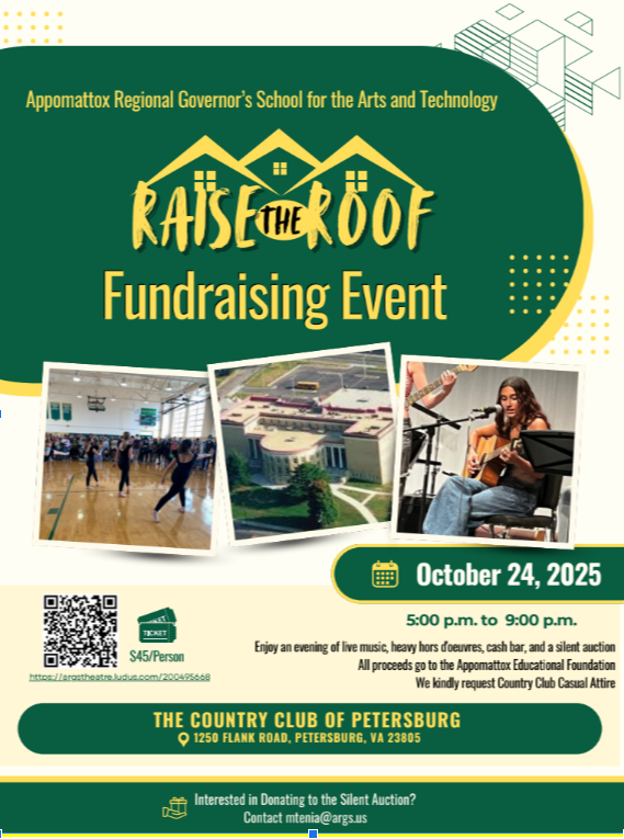 Join us for an evening of fun and fundraising at the Country Club of Petersburg. Enjoy heavy hors d’oeuvres, a cash bar, live music from Zane Carney and a silent auction. Bid on vacations, broadway tickets with a backstage tour and signed playbill and much more! All proceeds go to benefit the students of Appomattox Regional Governor’s School.