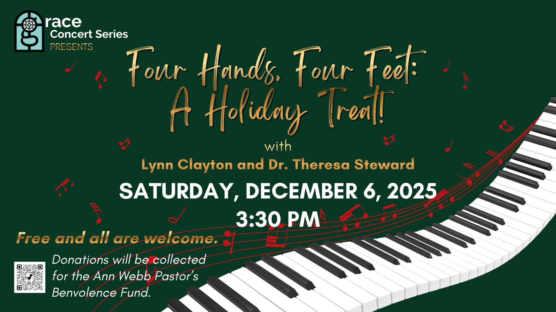 Grace Artists in Residence, Lynn Clayton and Dr. Theresa Steward, will perform a selection of Advent and Christmas classics for four-hand piano, organ and piano, as well as solo arrangements. There’s something for everyone in this program of classical and popular favorites! All offerings from this concert will support the Ann Webb Pastor’s Benevolence Fund which provides financial assistance for those most in need in our community.