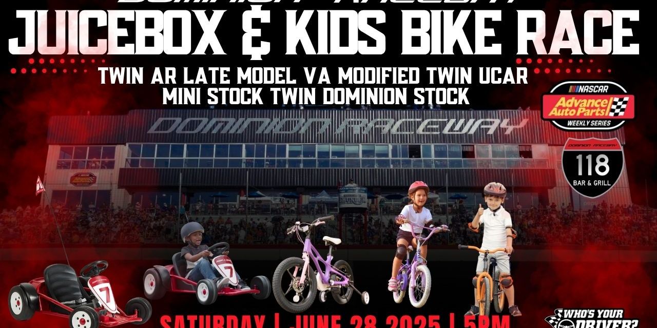 Twin AR Late Model VA Modified Twin UCAR Twin Dominion Stock Mini Stock. Parents bring your kids Radio Flyer Juicebox racer or bike and cheer them on before the NASCAR racing begins Saturday June 28th! Participants will be group by age, bring your own bike or juicebox to race (NO MODIFICATIONS) We will drop the green Flag for KIDS at 6:30pm on the front stretch before we go Advance Auto Parts weekly racing at 7pm!