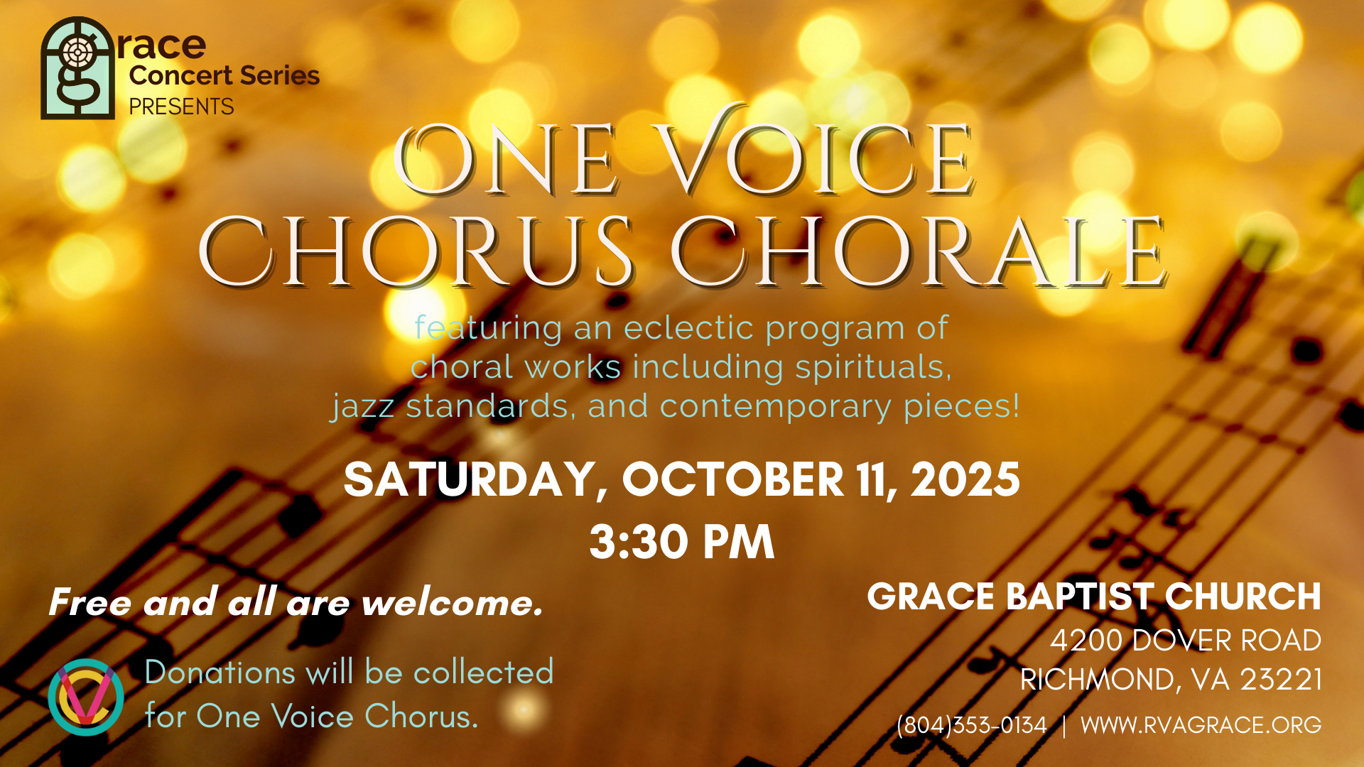 The Grace Concert Series presents the One Voice Chorus Chorale in concert. Join us for an eclectic blend of music, including spirituals, jazz, classical, showtunes, and more! Free and open to the public. Donations will be collected for One Voice Chorus, a non-profit community chorus emphasizing diversity and inclusion, that performs choral music for the central Virginia community.