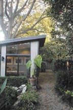 The result of his work is a simple, one room, 10- by-17-foot, glass and concrete structure (with a tool shed attached), that appears as a garden pavilion or folly when viewed from either the main house or its sprawling, wide-planked back deck that contains a hot tub.