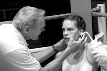 Lacking a truly inspirational script, Eastwood does what he can with his camera, and he does plenty. Though he goes to the well too often with Maggie’s repugnant family, his scenes with them and what it really means to be part of the lower class in America are the most lacerating since “Monster.” The look from outside the ring is similarly tough. The action is bloody and brutal. Swank is ugly, all ears and lips supported by pale muscles. She’s thoroughly believable as white trash. Eastwood, now almost 75, sometimes has the appearance of a cadaver, though this may not be acting. He always sounds like the same character from “Unforgiven,” but manages to add a few memorable grace notes to his routine.
