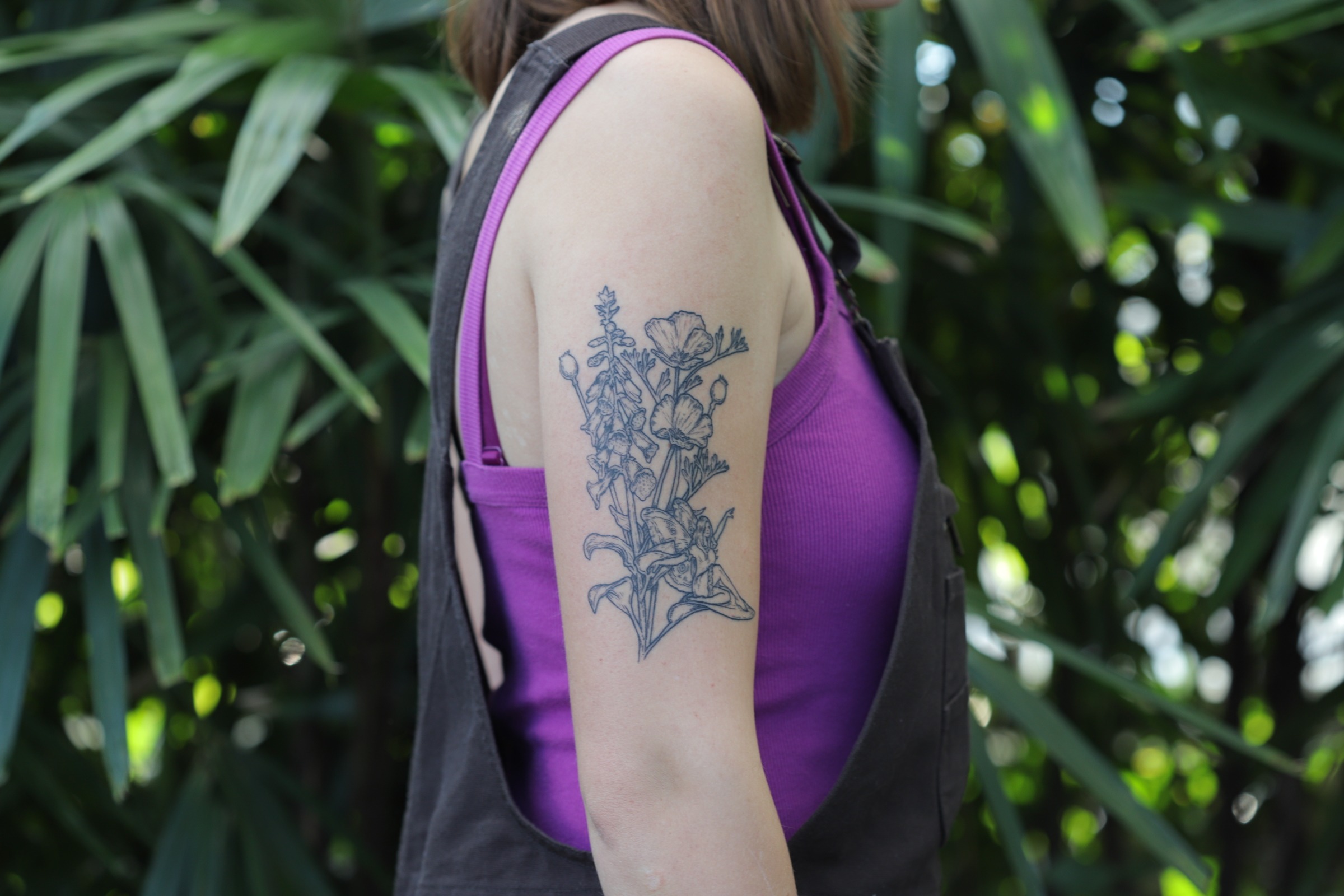 Now with five tattoos adorning their body, they chose to highlight their nature-based pieces, seeing Garden Ink as about celebrating the staff’s love for all things botanical. Derby also sees their participation as a way to share more about their connections to the art of tattooing and about themselves.