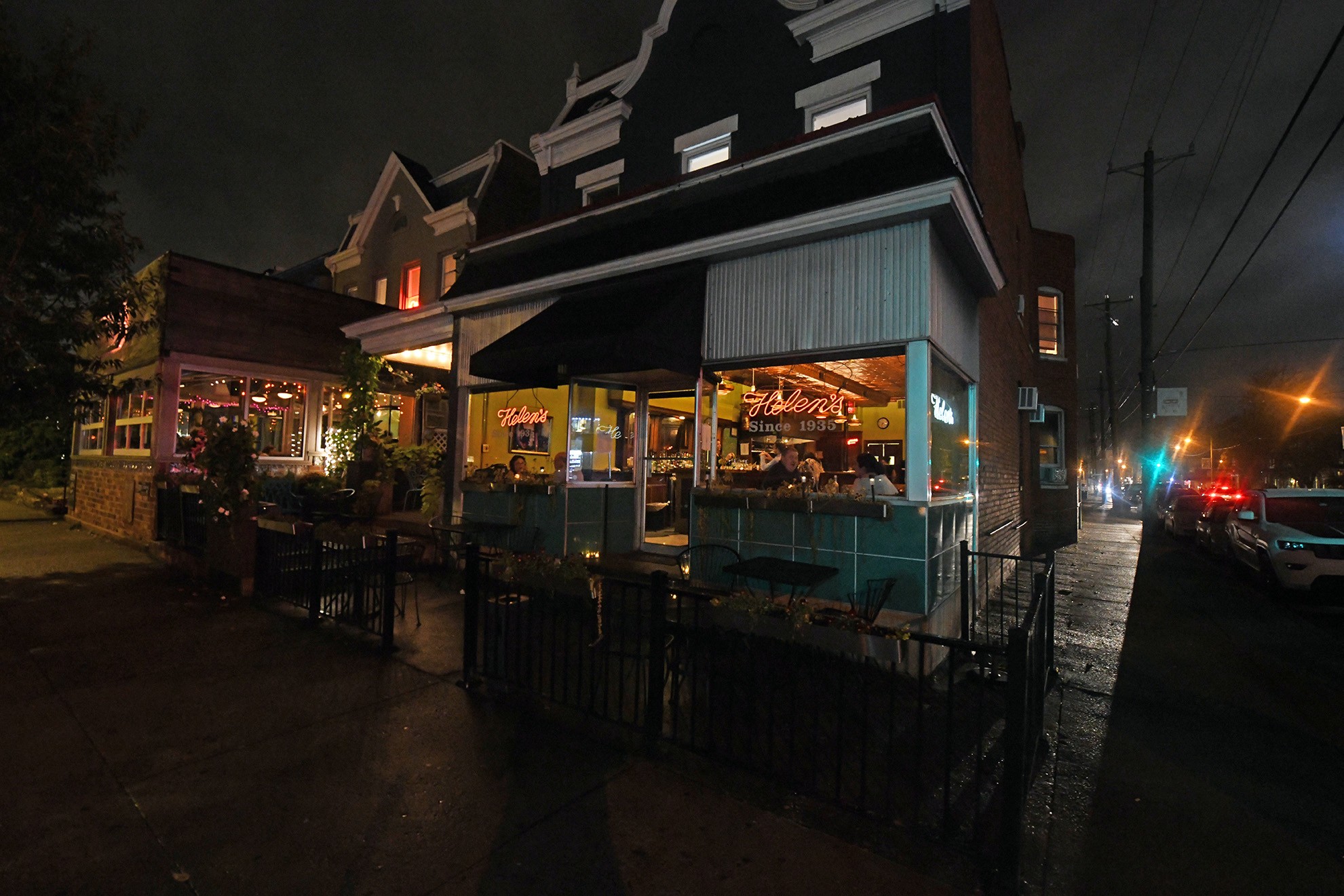 Her daughter Claire whizzes by in her crimson clogs, carrying plates of pork belly topped with sweet potato puree to customers. The alluring smell distracts briefly from the metallic copper ceilings and glowing cursive Helen’s sign the owner describes as speakeasy chic.