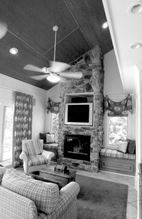 Sliding glass doors open to the living area, letting the sun pour in. The pastel green and pink color scheme flows from window treatments and pillows to chair cushions and furniture coverings. The focal point of the living area is the floor-to-ceiling cement stone gas fireplace, which is outfitted with the family’s large color television.