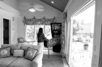 Sliding glass doors open to the living area, letting the sun pour in. The pastel green and pink color scheme flows from window treatments and pillows to chair cushions and furniture coverings. The focal point of the living area is the floor-to-ceiling cement stone gas fireplace, which is outfitted with the family’s large color television.