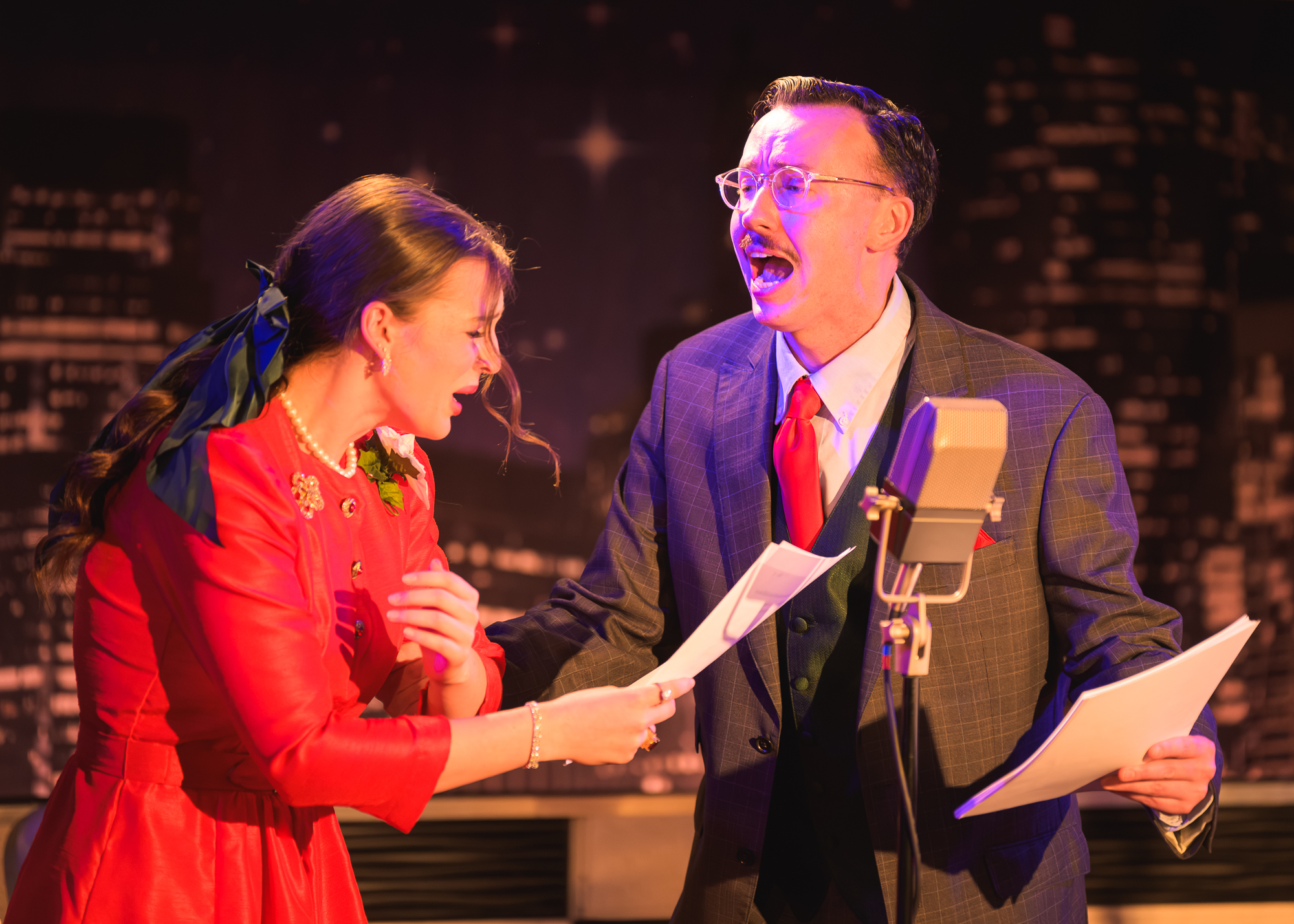 The setting for the show is radio station WBFR, complete with “Applause” and “On the Air” signs, where five actors gather on Christmas Eve in 1946 to present an audio version of “It’s a Wonderful Life.” Each actor has a 40s-era character that they’re playing but that persona never matters as much as the multiple roles they play in the radio drama.