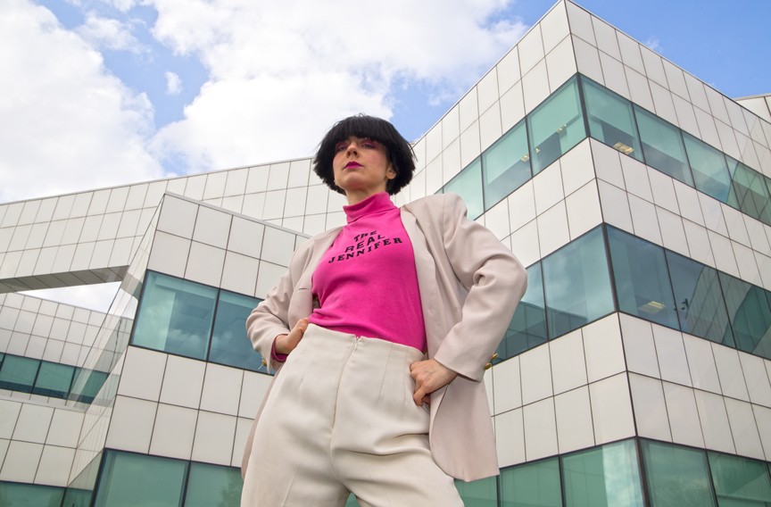 There are allusions to seduction and sexuality, but make no mistake: This rubbery disco diva is not here to titillate you. Kauffman explains that Vanilla “has no genitalia,” and is styled with a “shoulder-padded blazer to be all business.” She continues: “Jennifer Vanilla is a foreigner. She’s from the exotic land of Jenniferia on Planet Jennifer. She’s not an earthling, but she’s no stranger to Earth. She’s been here for ages, studying and absorbing humanity, and has gone through many cycles. … In that way, you could say she’s like a vampire — only a Jennifer.”