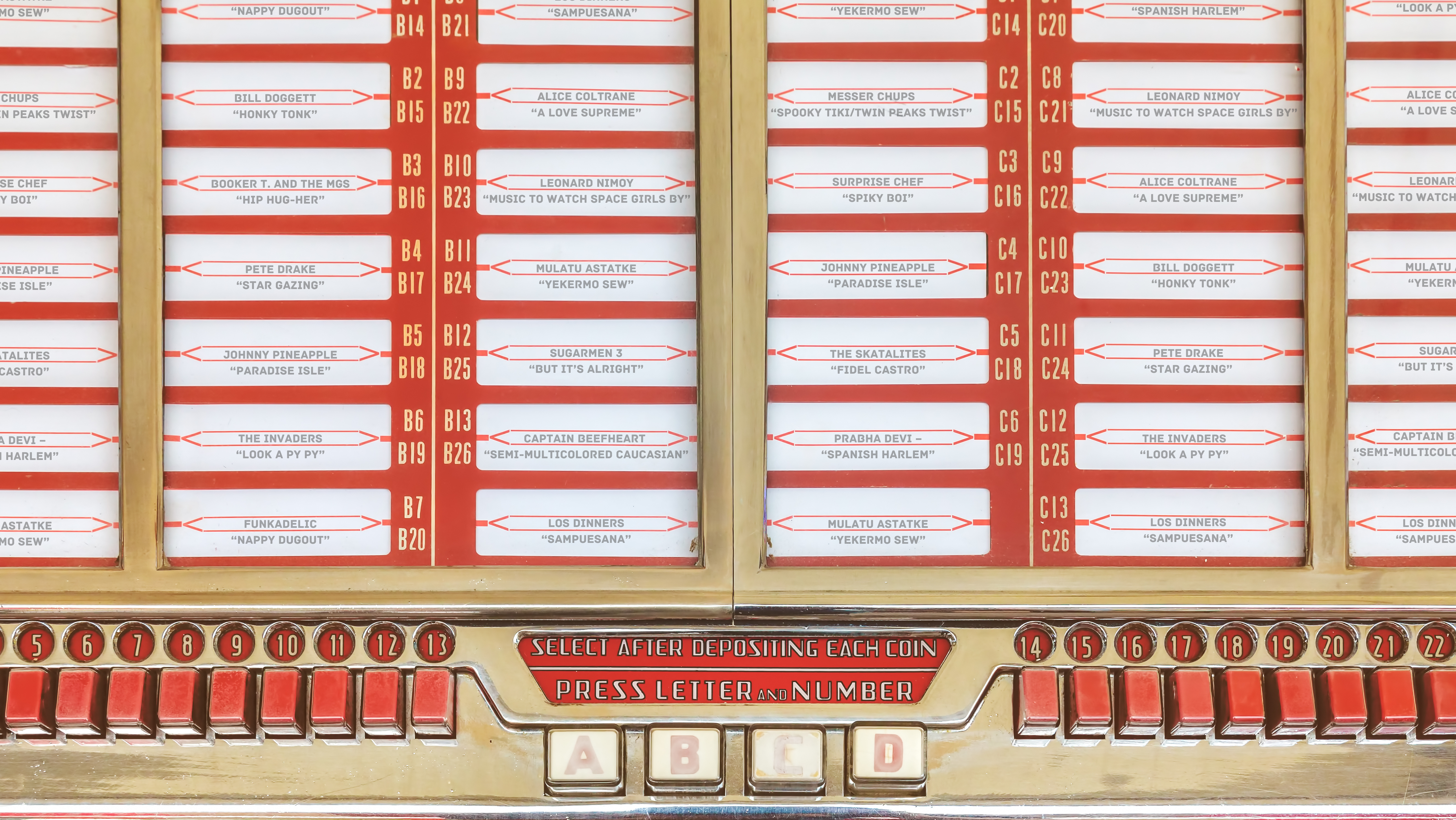 Below is a list of mostly instrumental tracks for the jukebox – plus a few newer ones at the end – that I would typically intersperse through songs by the likes of Ted Hawkins (“Happy Hour”), The Specials (“Ghost Town”), Nina Simone (“Funkier than a Mosquito’s Tweeter”), Nancy Sinatra and Lee Hazlewood (“Some Velvet Morning”), The Clash (“Lost in the Supermarket” or “The Magnificent Seven” 12-inch), Fela Kuti, Moondog, Peggy Lee, Howlin’ Wolf, you name it. –Brent Baldwin