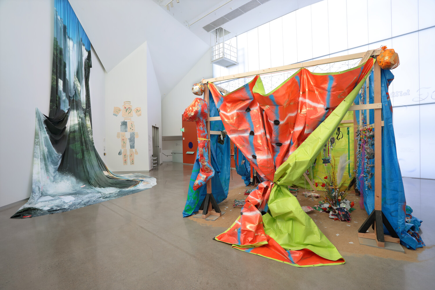 A large bright orange, blue, and green tent-like structure occupies the rest of the gallery. It is made of hastily hung tarps and inside is a pile of scattered debris, broken pieces of things, sand, fake flowers. It looks like both an altar and an abandoned human settlement. It has a nostalgia to it; whoever was here is gone, whatever this was built for is over. And this feeling is apropos because this piece is “spread (embassy)” (2024) and it accompanied a live performance by “ssSssssssssss,” a collaboration between the artists Ashkan Sepahvand and virgil b/g taylor. “ssSssssssssss,” pronounced like a long sibilant s sound (think hiss without the first two letters), literally leaves behind the evidence of an artistic creation as their contribution to “MURRMUR.” The toppled vessels, crumpled dollar bills, and tangles of LED lights in conjures ideas about the preservation of works of art themselves. Not everything every artist creates can be saved—so what gets preserved and why?