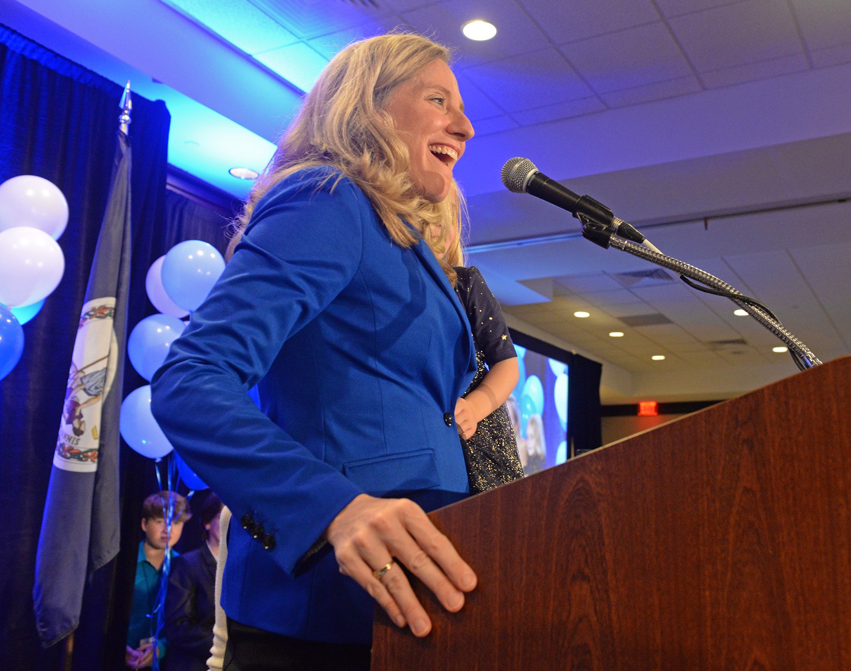Around 11:15 p.m., Spanberger’s husband and daughters follow her out and stand behind her among clusters of blue and white balloons as she addresses the jubilant crowd. In the audience are her family (some of whom are Republicans, according to her staff), volunteers, staff, supporters and friends who traveled from as far as Hamburg, Germany. Smiling ear to ear, she waits for the noise to die down before steadily delivering her victory speech.