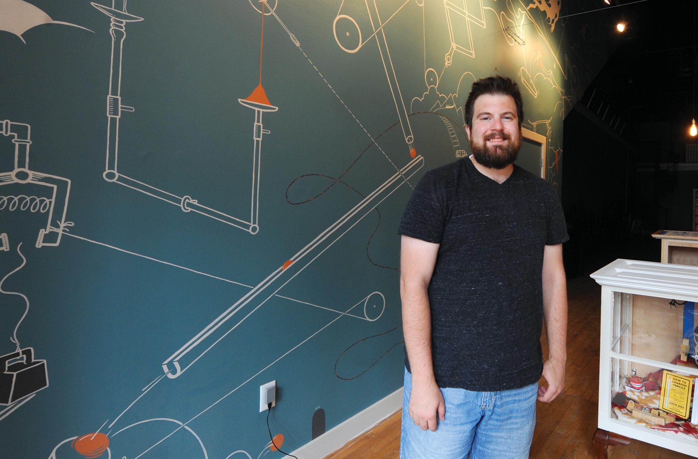 Walking in the door of the theater, you’re greeted with a mechanical-feeling mural by artist Michael Broth that offers a take on a Rube Goldberg device, in which a bunch of unnecessary steps are taken to accomplish something small or ridiculous — a visual representation of the improvisational comedy the troupe promotes.