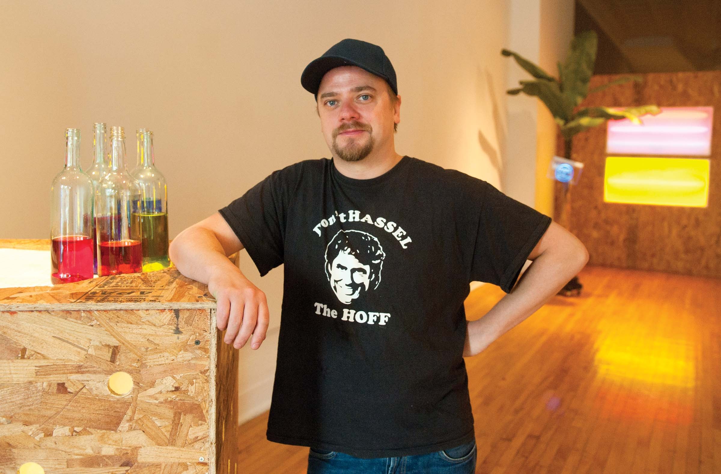 Hüttel has made eclectic vignettes the basis for his artistic body of work. And his tastes and derivations come from very specific places. He likes disco, the bar and club scenes, and other aspects of kitschy nightlife culture that pervade the world — from Scotland, where he studied art, to Miami, where he embarked on a cruise last summer. This tropical adventure inspired the exhibition at 1708 Gallery, his first solo show in the United States, called “Space Time Colour Eclectic.” He makes it a point to clarify: “The tackiness … I embrace it. It’s not ironic.”