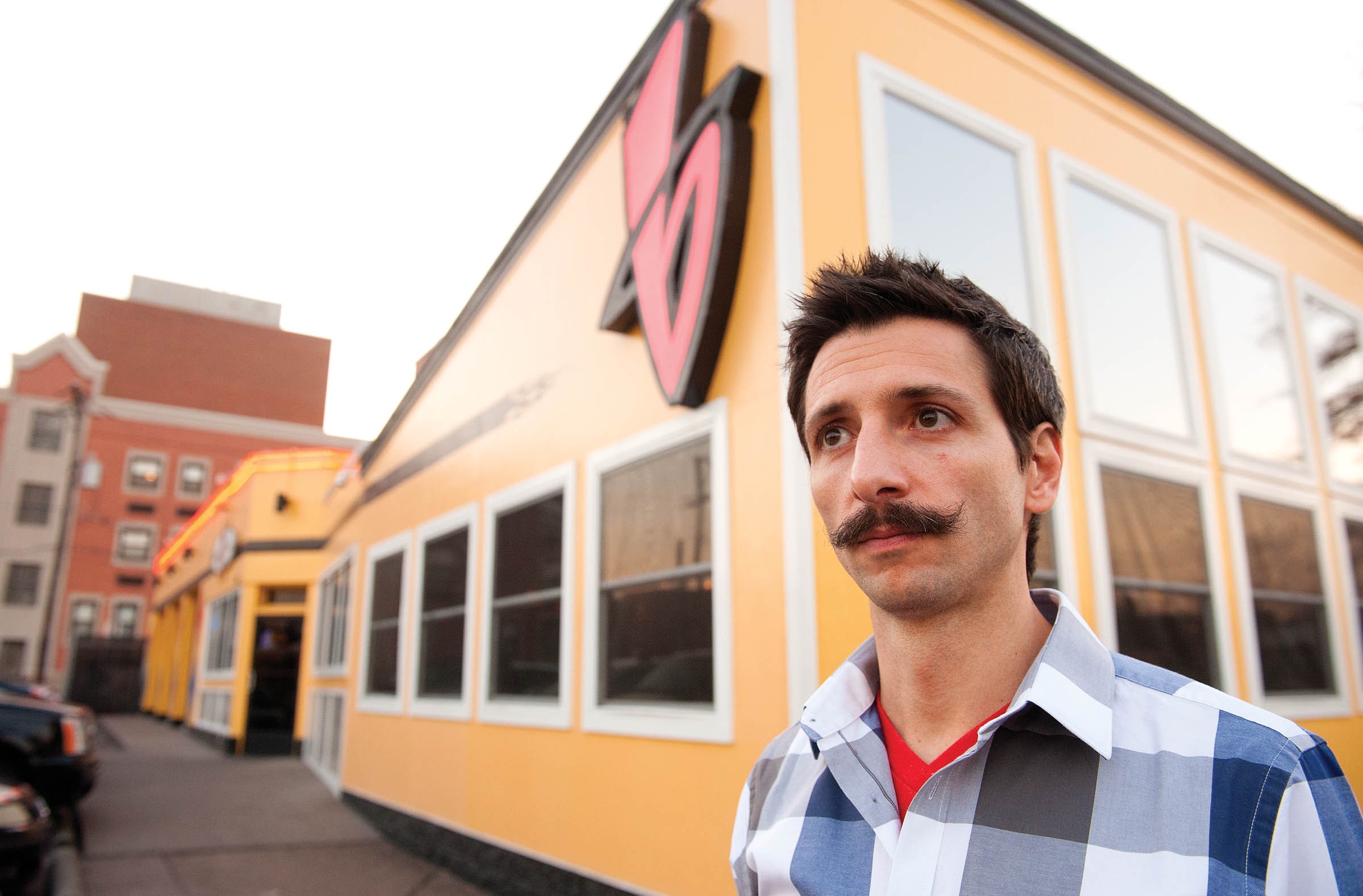 Lean (OK fine, rail-thin), mustachioed (at times) and with a sort of controlled frenetic energy, he easily could pass for your average hipster, although someone once told me that he’s 44 years old. I think I spit up my shot of Rumple Minze. Forty-four? The guy doesn’t look a day over 23.