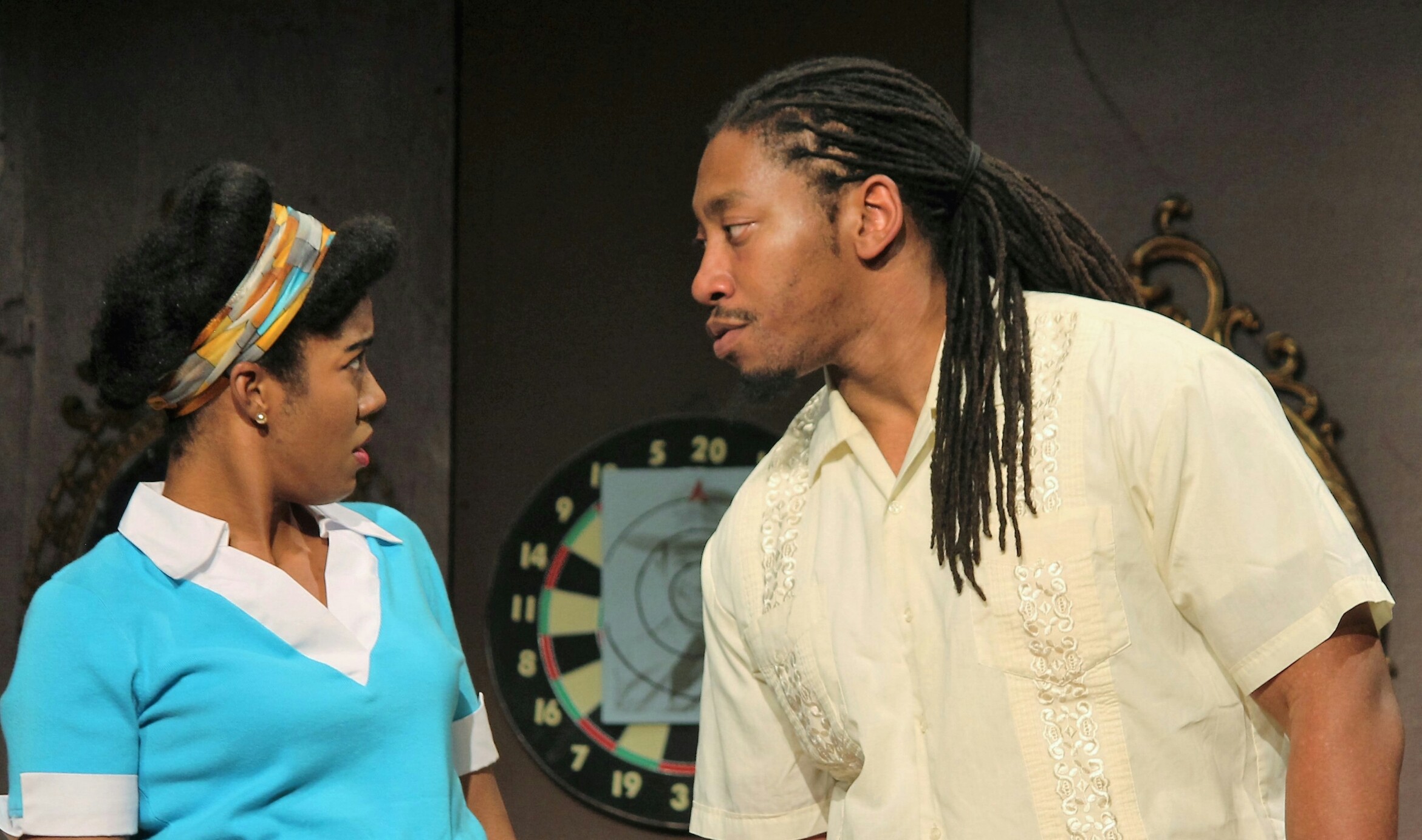 The set, designed by Vinnie Gonzalez, is simple. It’s sparse but evocative, immediately placing us in the proper time and place while delineating the various spaces, both onstage and off, in which the many small dramas play out. One of the theatrical delights is watching the story unfold via multiple simultaneous moments in these separate but connected spaces.