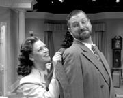 As Whiteside, Joe Pabst at first appears too young … his performance a trifle too mannered. But that’s probably because an older Monty Woolley made such an indelible impression as the character in the Hollywood version of the script. It doesn’t help that the first act takes a little while to get going. It is certainly the weakest of the three. But after a while, Pabst seems to fill his lounging jackets (that always seem to match the Stanleys’ rug) with more authority and confidence.