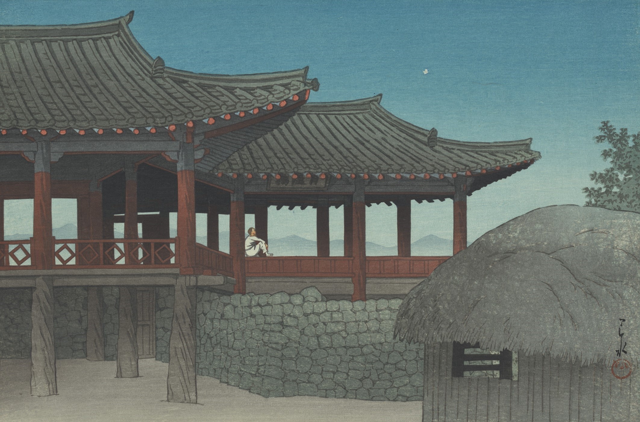 A diminutive and short-sighted man who relied on thick eyeglasses, Hasui was constantly on the road looking for new subjects, Taylor says. “Mainly in Japan. He was always searching for subject matter and the scenes he found in Korea weren’t dissimilar to his [other] work. He loved Buddhist temples, mountains, because they are great subjects for printmaking. What’s also interesting is that he’s a master of different seasons and different times of year. He can make a print or a painting of a building in snow or in summer.”