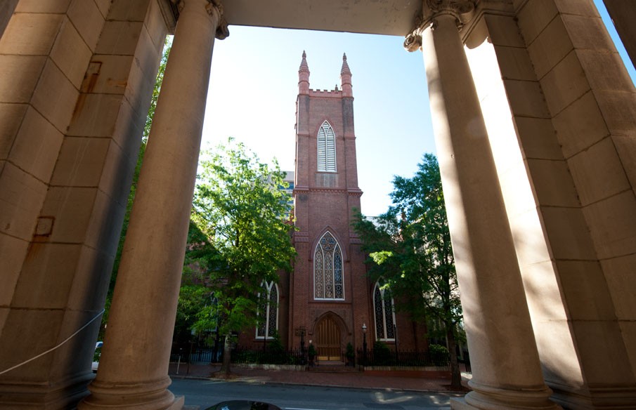 Second Presbyterian Church is situated today in a block across the street from the YWCA (as shown) and Penny Lane Pub. This was the center of one of Richmond’s most fashionable residential neighborhoods during the Civil War. The Gothic Revival structure was built in 1845 according to plans by New York architect Minard LaFever. For more than half a century, including the war years, the congregation’s pastor was Moses Hoge, who also served as a Confederate chaplain and some historians suggest was an arms runner in the guise of getting Bibles through battle lines. It was in this church that Stonewall Jackson worshipped during his occasional wartime visits to Richmond. In April 1865 the sanctuary’s stained glass windows were blown out by nearby explosions caused by the evacuation fires.