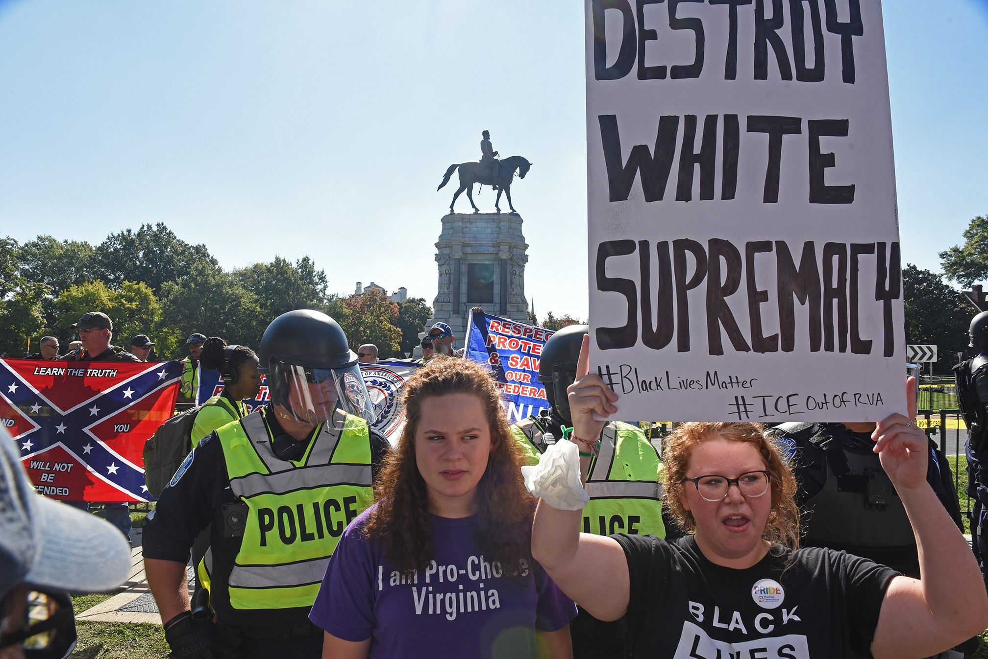 The temperature rose alongside the volume of counterprotesters, eventually cuing cops in riot gear to form a human barrier and, as a byproduct, absorb angry chants hurled at the visiting ralliers. Strategically, the Virginia State Police and Richmond’s force proved to have learned from Charlottesville. Rally points were segmented, and squads of armored officers were positioned to separate groups more as they formed.
