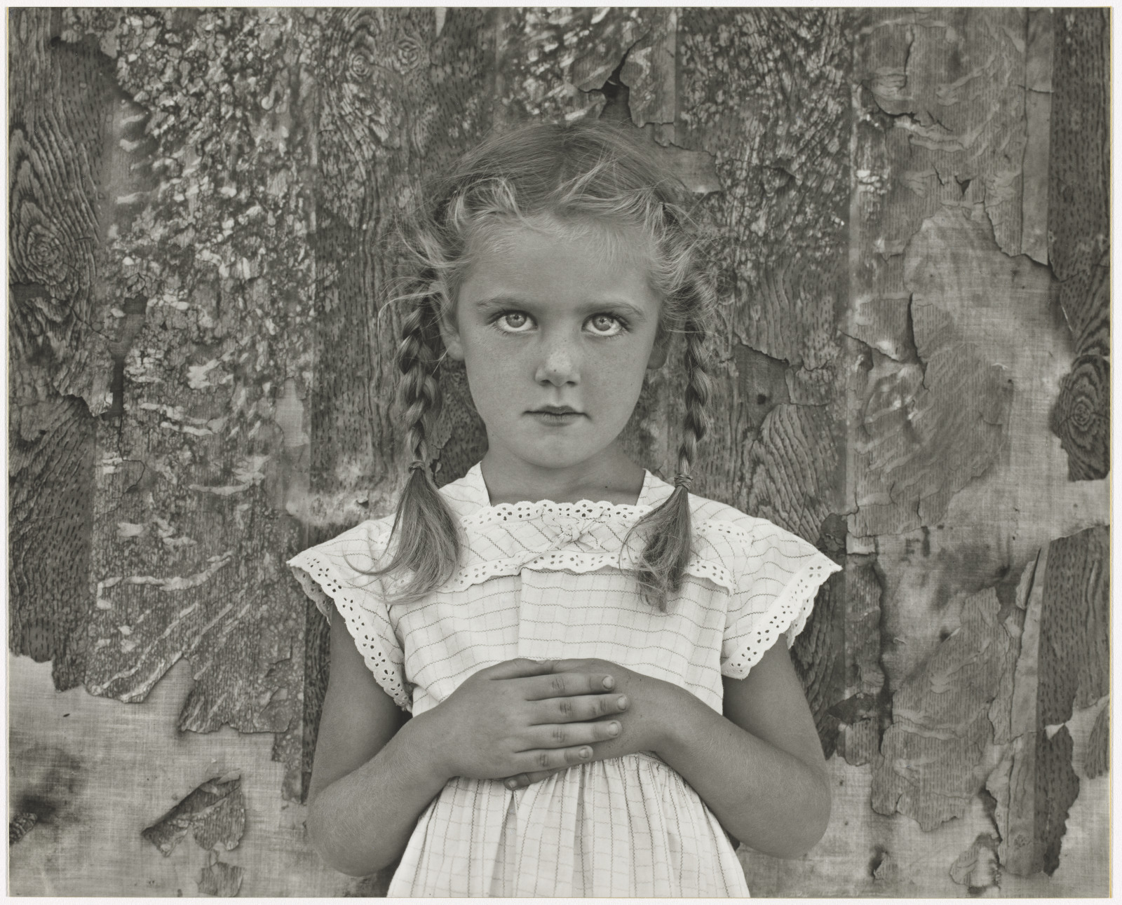 Fast forward nearly 50 years from Erwitt’s enigmatic image to German photographer Sibylle Bergemann’s “Elizabeth, Berlin” image from 2002, depicting a very different sense of childhood. The close-up photograph of a young girl addresses some of the ways femininity is taught, learned and practiced from a shockingly young age. The child’s unwavering gaze and carefully applied lipstick project an adult confidence that few children in 1955 likely could have called upon. At once compelling and disturbing, the photograph makes clear that Elizabeth not only knows how to strike a pose for the camera, but she also possesses an awareness, not to mention a level of comfort, of what it means to be looked at. Childhood is already in her rearview mirror.