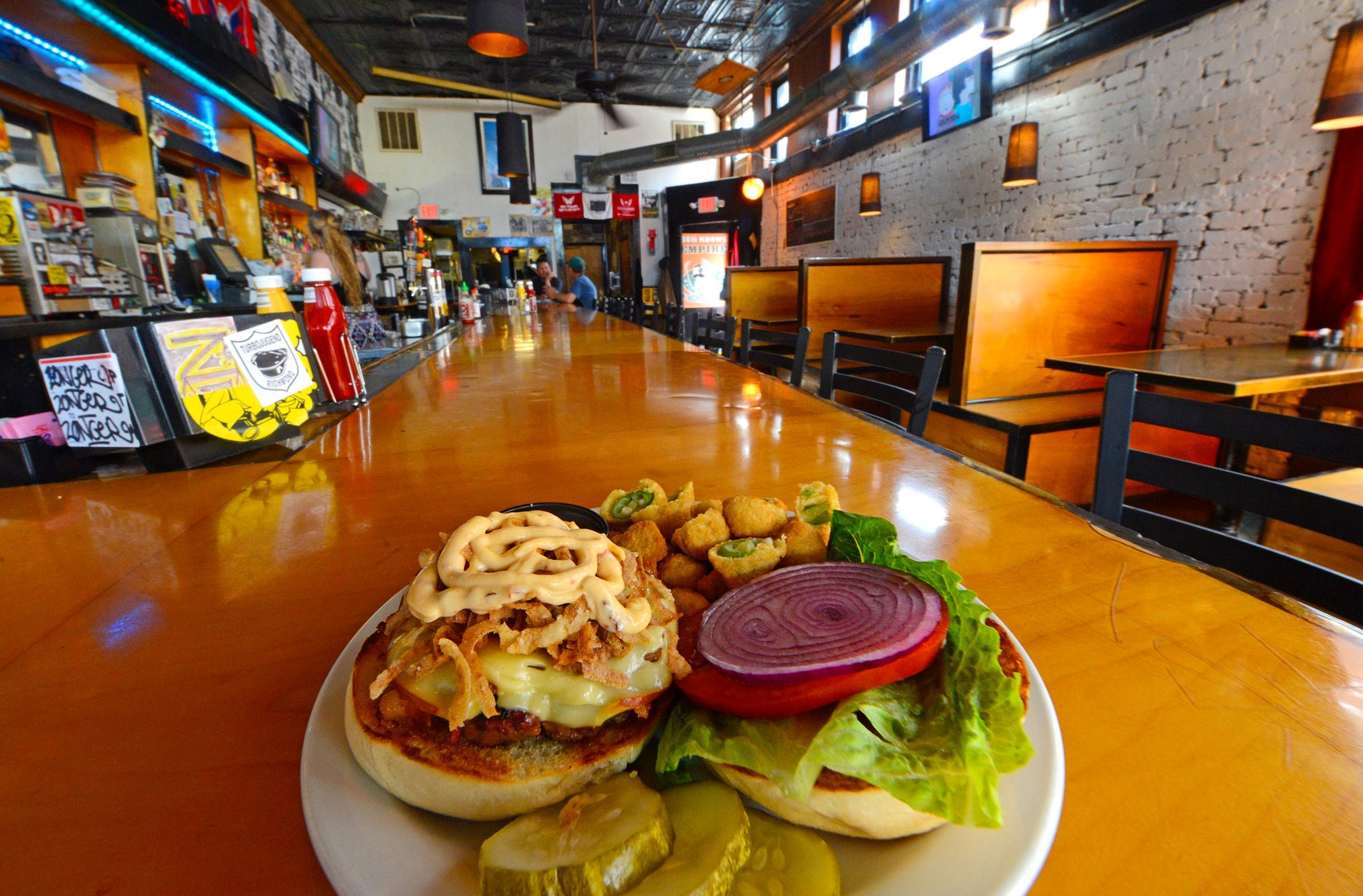 As far as getting vegetarians’ butts in seats, there are five options including a sloppy jane ($7.95) and the face plant ($7.95), labeled “so good it’ll knock you on your face,” with grilled eggplant and pickled beet salad, arugula and feta atop wheat-berry bread.