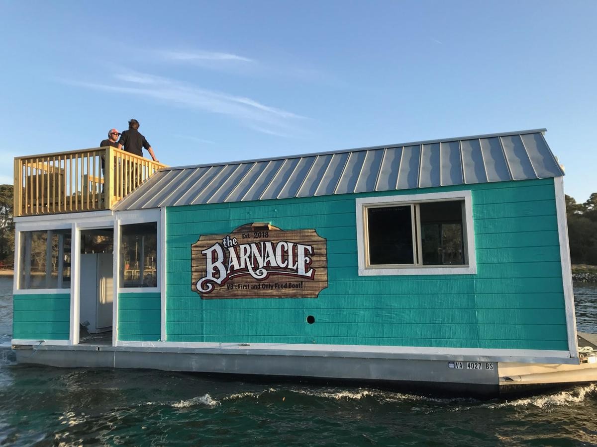 “The Barnacle,” says a sign painted on the floating eatery by local artist Sam Welty. “VB’s first and only food boat!”