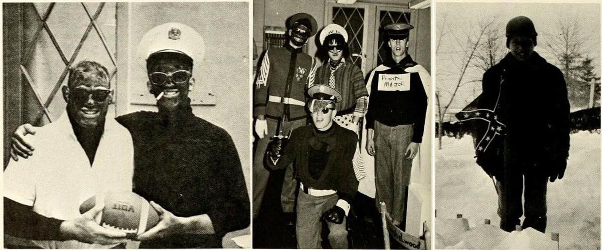 On one page of the yearbook, a student poses in blackface, surrounded by others in costumes at a party. Another page features a photo of two men in blackface holding a football.