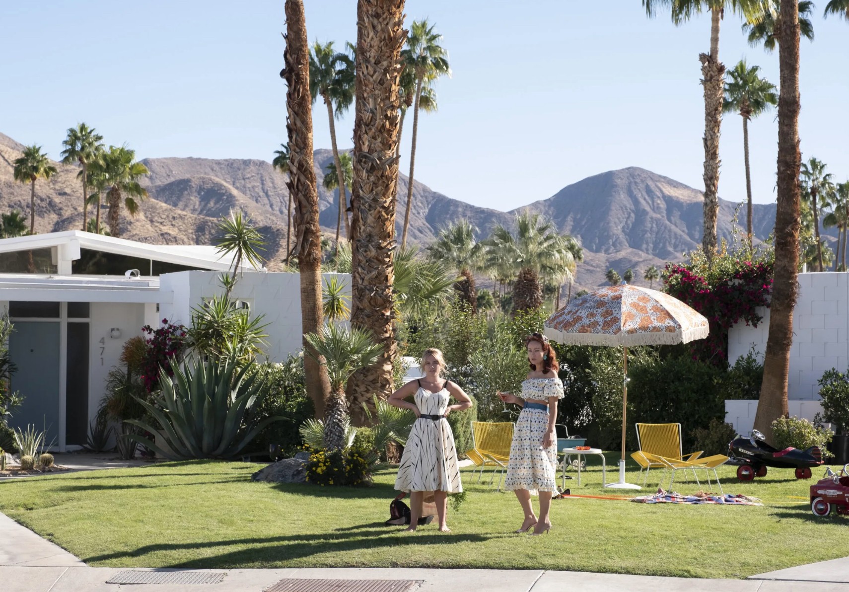 At a certain point, though, you may start playing a game, trying to sort the intentional dissonances from those born of fake-smart sloppiness. Styles’ shifting accent—sometimes he’s British, as in real life, sometimes American, sometimes both—is a subtle and chilling joke. The needle drops don’t all make sense, which is something Wilde could have had more fun with. Instead, she sprinkles in Busby Berkeley numbers for no discernible reason. And a quest to discover the origins of a crashed plane means less than nothing.